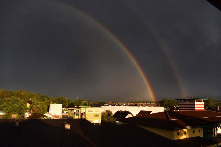 Bin auf meinem Weg zurück nach Hause. Liege bei offenem Fenster in meinem Hotelzimmer und lasse die kalte Luft ins Zimmer. Nach diesem extrem heißen Tag ein Segen. Ein Gewitter schenkt (mir) diesen wunderbaren Regenbogen.