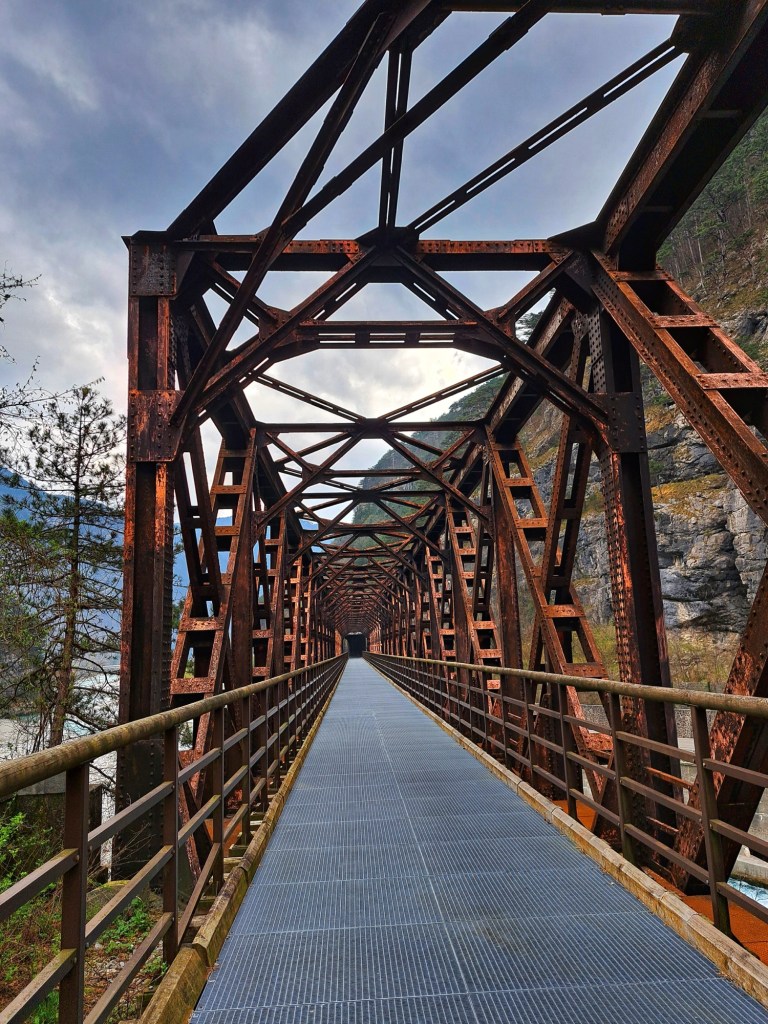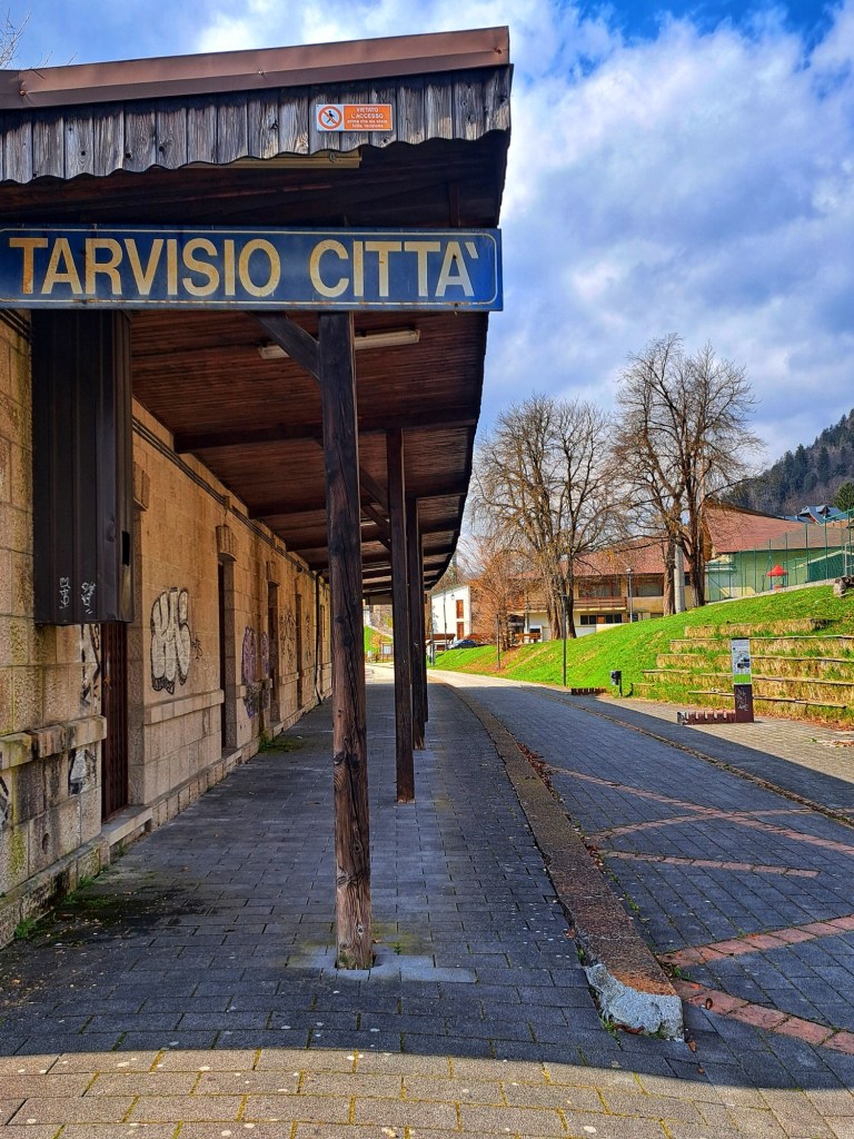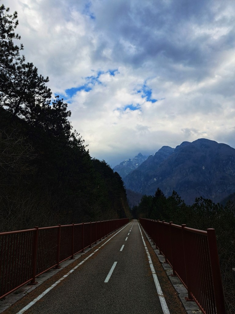 91 km von Villach nach Venzone sind geschafft. Auf Trasse der alten, stillgelegten Pontebbana-Eisenbahnstrecke durch das Kanaltal hatte ich heute das Gefühl zu fliegen, wobei zuvor die Reise äußerst schlecht begonnen hat. Meine hintere Radtasche reißt beim Start, so dass ich eine neue kaufen muss. Dieses Missgeschick verunsichert mich so, dass ich Angst bekomme und überzeugt bin, mich mit dieser kurzen Reise zu überfordern. An der italienischen Grenze ist diese Angst plötzlich wie weggeblasen und ich genieße die Fahrt durchs Kanaltal trotz Wind und Kälte.