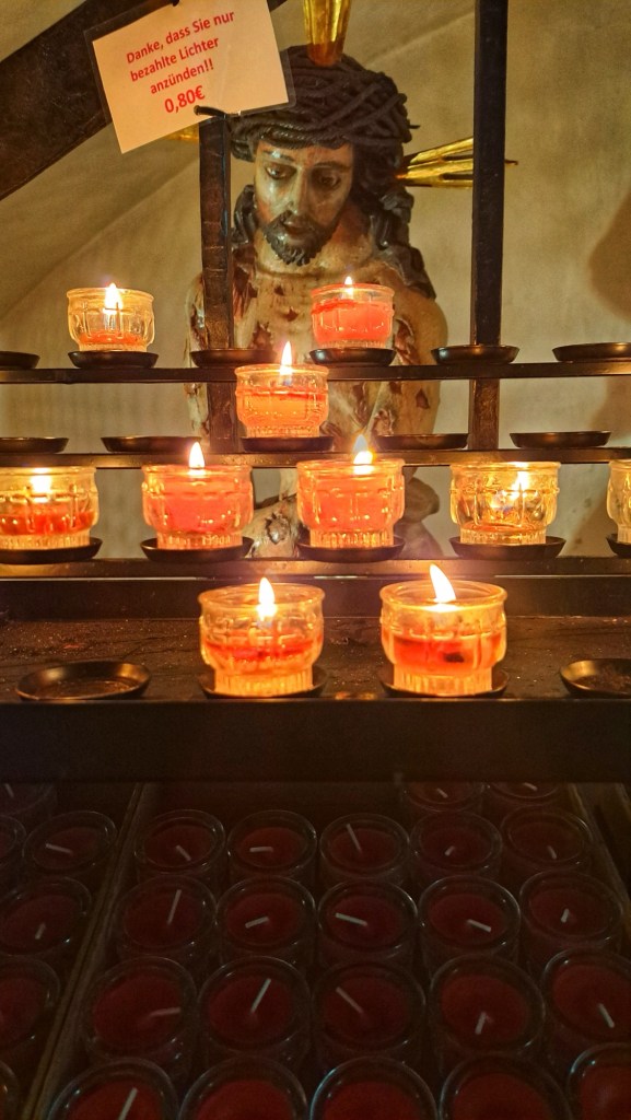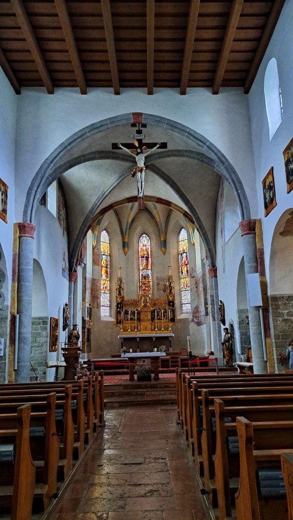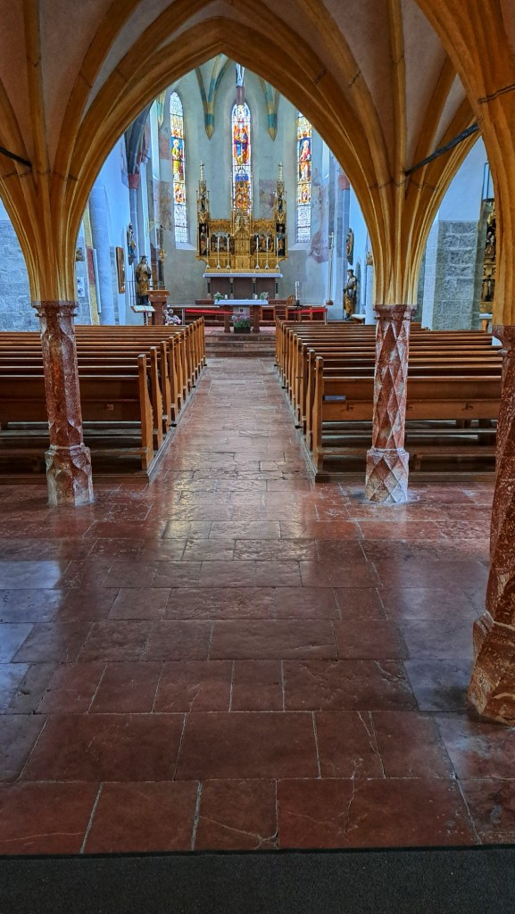 Mein heutiger Pausentag ist von Arbeit geprägt. Ich führe zahlreiche Telefonate und beantworte Mails. Als es mir zu viel wird, flüchte ich mich in die Stadtpfarrkirche. Ich genieße dort Stille und Einkehr. Die Kirche ist voller kunsthistorischer Schätze. Man findet einen keltisch-römischen Reliefstein, römische Spolien (wiederverwendete Bauteile, die gut sichtbar integriert sind) eine frühmittelalterliche Krypta und eine spätgotische Empore. Hervorstechend ist auch der mächtige Westturm.