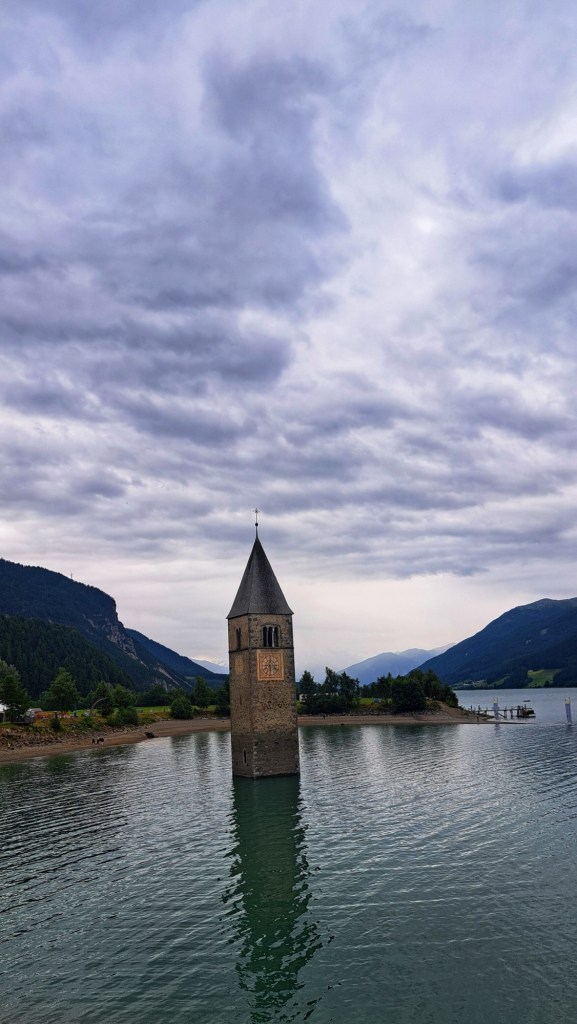 1950 wurden die Ortschaften wie geplant überflutet. Energiepolitisch brachte der Stausee nichts und der alte Kirchturm von Graun ragt heute als Mahnmal für eine völlig verfehlte Politik aus dem Reschensee. Der italienische Schriftsteller Marco Balzano hat in seinem sehr berührenden Roman „Ich bleibe hier“ die Geschichte des Orts Graun niedergeschrieben.
